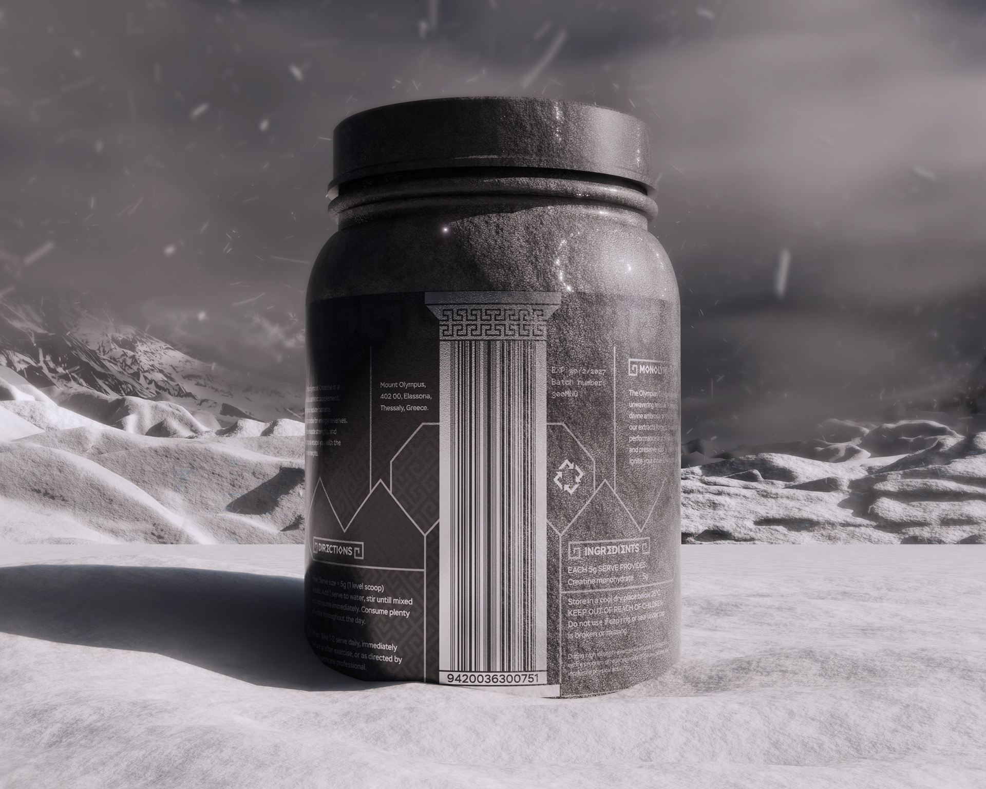 I developed a complete brand identity for a creatine monohydrate product, including packaging design and a creative barcode that adhered to strict global standards. Inspired by Olympians, Hercules, and Greek mythology.