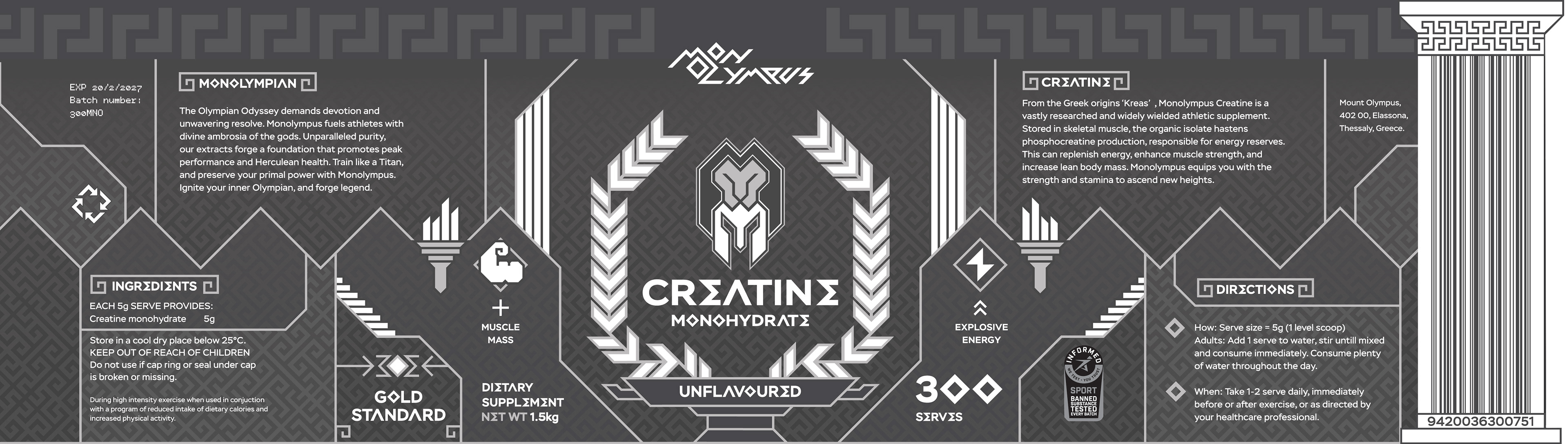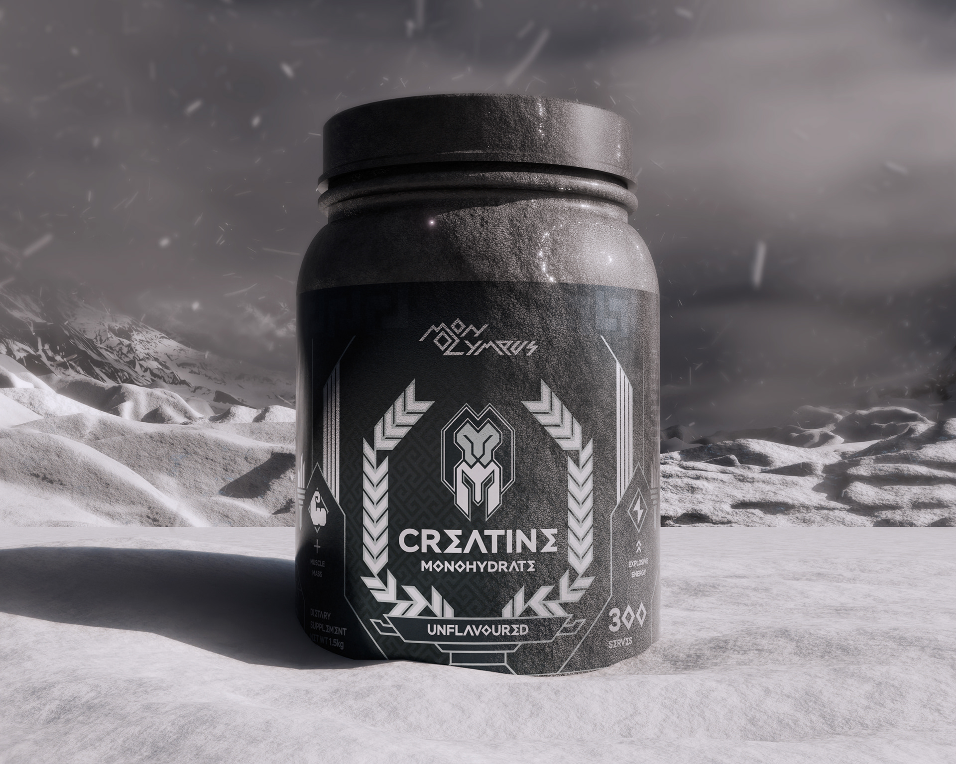 Monolympus blends Creatine Monohydrate with Mount Olympus, home of the gods. Mono reflects singularity, the one to ascend new heights, who dares to stand amongst the gods.