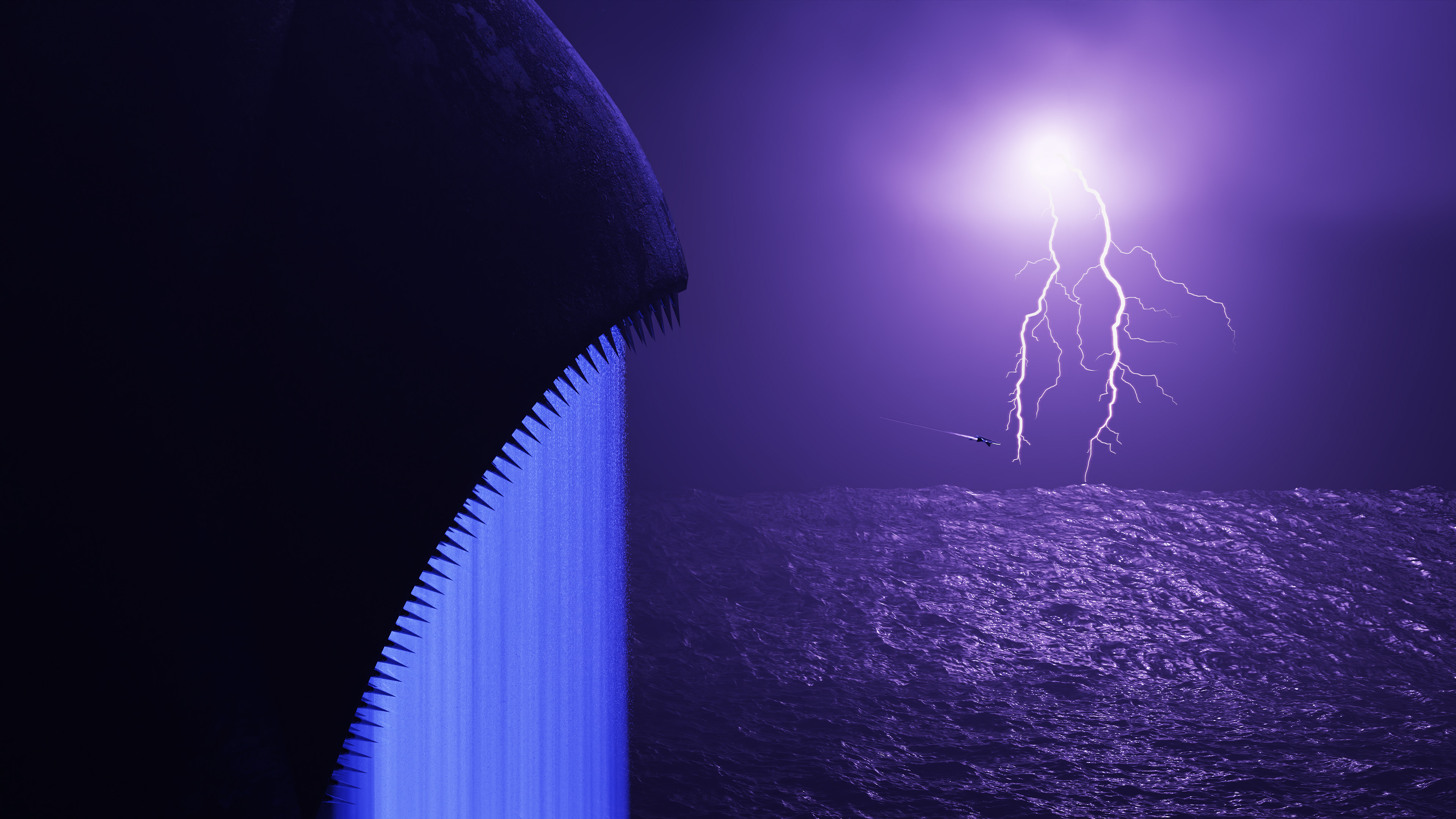 This 3D animation explores a dark future without land, an endless storm, torrential rain, and colossal 1km waves. Endless night, thick polluted haze, lit only by lightning.